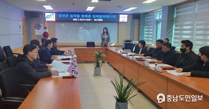 (금산=충남도민일보) 금산군농업기술센터는 지난 22일 센터 종합상황실에서 농작물 병해충 방제협의회 위원 10명이 모인 가운데 올해 과수화상병 및 돌발해충 방제 약제 선정을 위한 농작물 병해충 방제협의회를 개최했다.