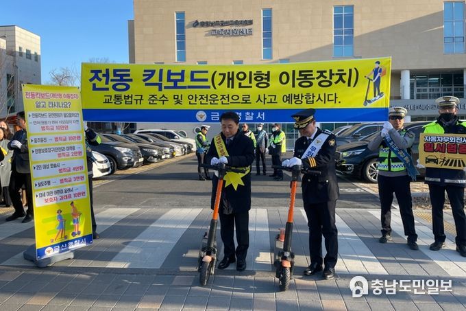 (금산=충남도민일보) 금산경찰서는, 3월 2일 금산여중·여고, 금산산업고 앞에서 교육지원청, 학교, 군청, 학교자모회, 모범운전자, JC 등 유관기관과 함께 전동킥보드·이륜차 교통사고 예방을 위한 캠페인을 실시했다.
