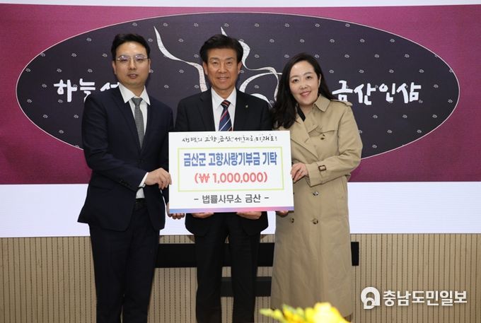(충남도민일보) 법률사무소 금산 소속 진영욱‧지자람 변호사는 지난 7일 금산군에 고향사랑기부금 100만 원을 기부했다.