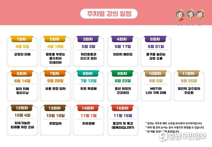 교육은 오는 4월 5일부터 11월 15일까지 금산읍 여성창의문화센터에서 여성의 역량 강화 및 사회참여 확대를 위한 인문, 생활, 문화 등 강의를 진행할 예정이다.