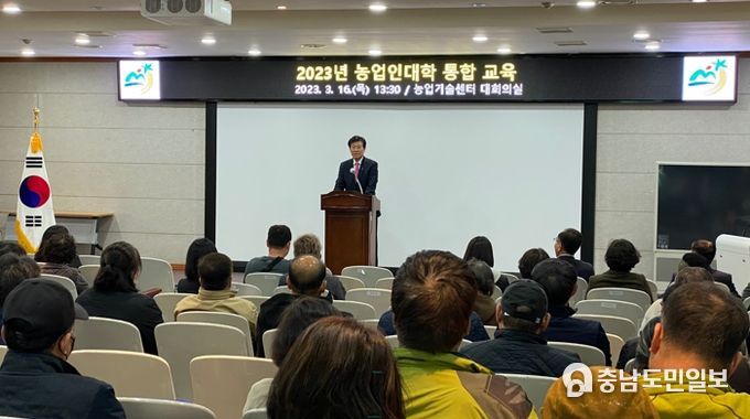 (금산=충남도민일보) 금산군은 지난 16일 금산군농업기술센터에서 전교생 125명이 참여한 가운데 2023년 농업인대학 통합교육을 개최했다.