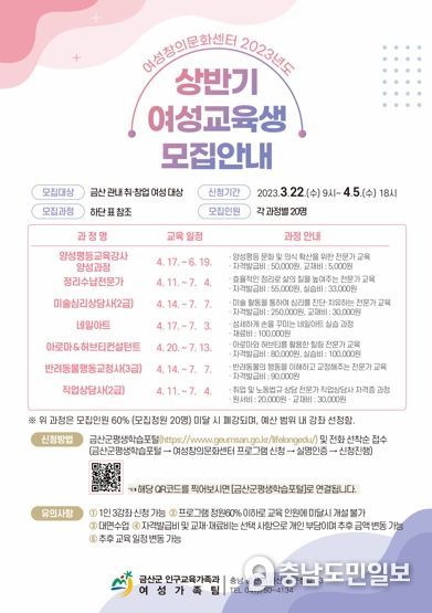 교육 인원은 과정별 20명이며 1인당 최대 3강좌까지 수강할 수 있다. 강의는 오는 4월 10일부터 7월 14일까지 금산읍 청산회관에 위치한 여성창의문화센터에서 진행할 예정이다.