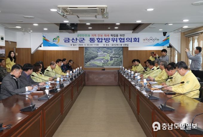 (금산=충남도민일보) 금산군은 지난 22일 군청 상황실에서 박범인 금산군수를 비롯해 관내 민·관·군·경·소방 등 주요 기관장 20여 명이 참여한 가운데 2023년 1분기 통합방위협의회 회의를 개최했다.