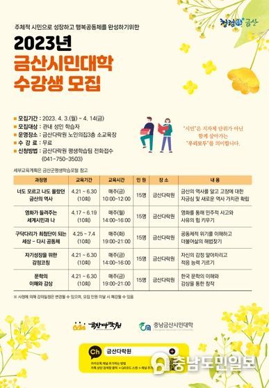 군 관계자는 “금산시민대학을 통해 주민이 지역사회가 함께 성장하는 계기를 만들어 나갈 것”이라며 “올해 수강생 모집에 많은 관심을 당부드린다”고 말했다.