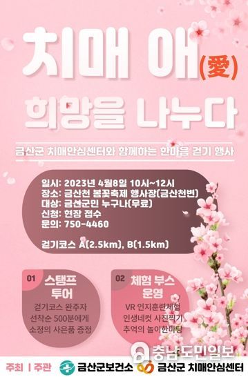 (금산=충남도민일보) 금산군보건소는 오는 8일 금산읍에서 열리는 금산천 봄꽃 축제장에서 ‘치매 애(愛)희망을 나누다’를 주제로 제4회 한마음 치매극복 걷기행사를 개최한다.