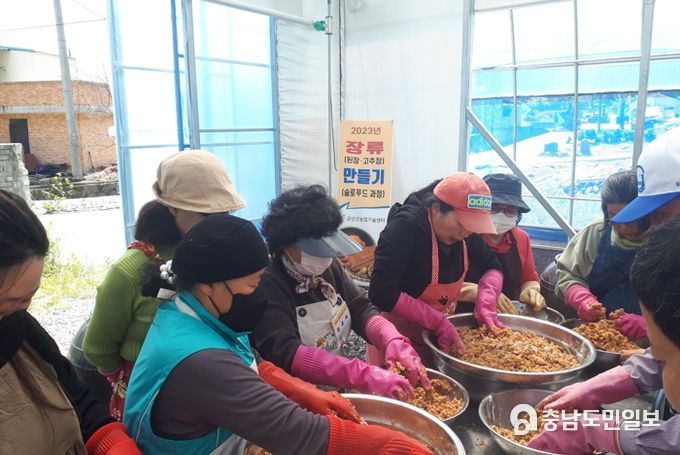 (금산=충남도민일보) 금산군은 지역특화농산물 활용을 위해 지난 27일 진산면 들꽃된장에서 진행된 전통된장 만들기 교육이 호응을 얻었다고 밝혔다.