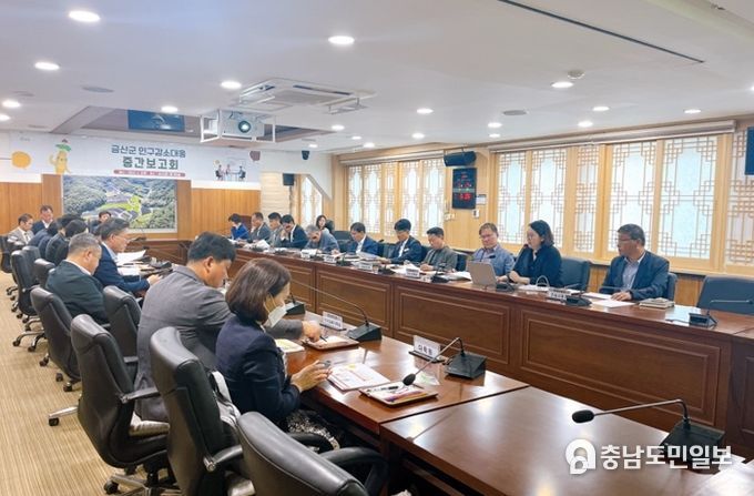 (금산=충남도민일보) 금산군은 지난 10일 군청 상황실에서 박범인 군수를 비롯한 부군수, 국장, 담당관, 과장 등 20여 명이 참석한 가운데 금산군 인구감소 대응 계획 수립 연구 용역 중간보고회를 개최했다.