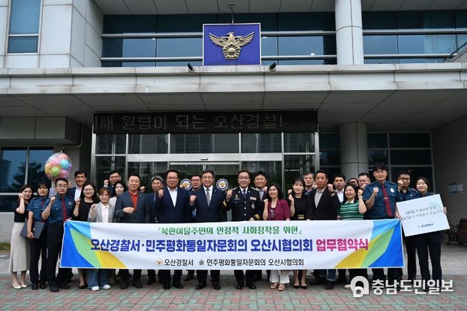 (충남도민일보 / TV / 안희진기자) 민주평화통일자문회의 오산시협의회(회장 황태경)는 박정웅 오산경찰서(서장 박정웅)와 지난 30일 오산경찰서에서 소회의실에서 북한이탈주민의 성공적인 정착지원을 위해 업무협약을 체결했다.