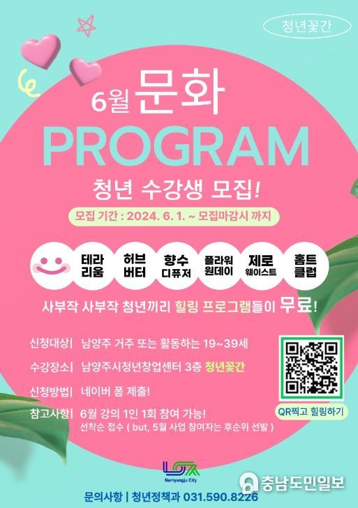 (충남도민일보 / TV / 안희진기자) 남양주시는 오는 6월 11일부터 남양주청년창업센터(남양주시 늘을2로14번길 12) 내 청년꽃간에서 청년의 다양한 관심사를 반영한 6개 문화프로그램 운영한다고 31일 밝혔다.