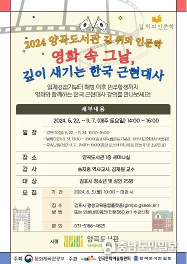(충남도민일보 / TV / 안희진기자) 김포시 양곡도서관은 2024년 길 위의 인문학 공모사업에 선정되어 오는 6월 22일부터 9월 7일까지 매주 토요일 양곡도서관에서 영화 속 한국 근현대사를 주제로 길 위의 인문학을 운영한다.