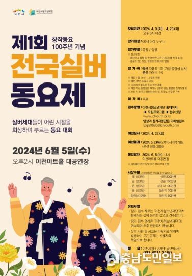 (충남도민일보 / TV / 안희진기자) 이천시에서는 한국 창작동요 100주년 기념행사로 2024년 6월 5일 제1회 전국실버동요제를 전국 최초로 개최한다고 밝혔다.