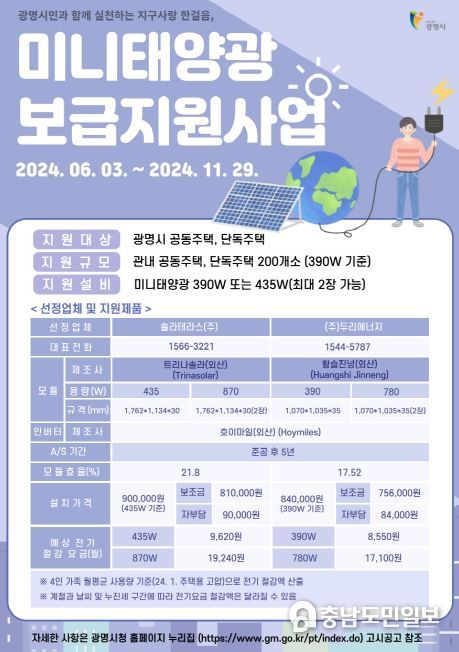 (충남도민일보 / TV / 안희진기자) 광명시는 재생에너지 보급 확대를 위해 공동주택, 단독주택을 대상으로 미니태양광 설치 보조금 지원사업을 시작한다.
