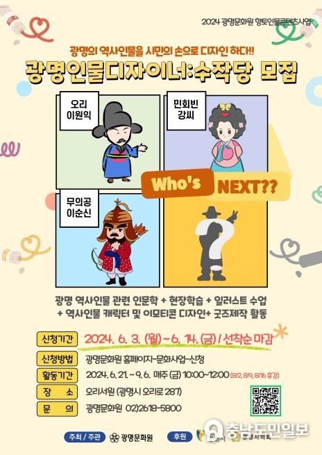 역사 인물을 연구하고 일러스트 수업을 통해 캐릭터를 완성해 가는 작업에 참여하고 싶은 광명시민은 누구나 6월 3일부터 광명문화원 홈페이지를 통해 참여를 신청할 수 있다.