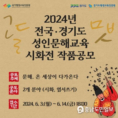 (충남도민일보 / TV / 안희진기자) 경기도와 경기도평생교육진흥원은 문해교육에 대한 사회적 인식 확산을 위해 오는 3일부터 14일까지 ‘경기도 성인문해교육 시화전 작품 공모전’을 진행한다.