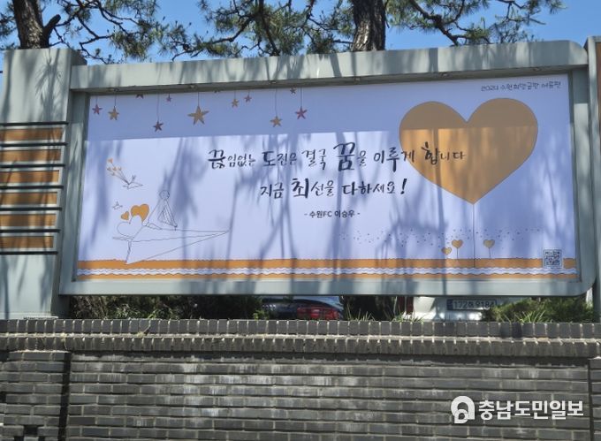(충남도민일보 / TV / 안희진기자) 수원시가 2024년 수원희망글판 여름편 문안 ‘끊임없는 도전은 결국 꿈을 이루게 합니다. 지금 최선을 다하세요!’를 8월까지 수원시 곳곳에 있는 게시대와 수원시 공식 유튜브 채널에 게시한다. 수원FC 이승우 선수의 메시지다.