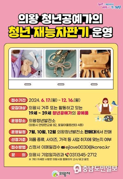(충남도민일보 / TV / 안희진기자) 의왕시는 관내 청년 공예가의 공예품 홍보 및 판로지원 등을 통해 청년 공예가의 재능을 장려하고 진로 설정에 도움을 주고자‘청년 재능자판기’ 운영을 시작한다고 밝혔다.
