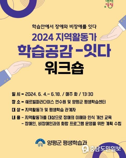 (충남도민일보 / TV / 안희진기자) 양평군은 지역 중심의 장애인 평생교육 기반 조성을 위해 장애와 비장애를 학습으로 잇는 ‘학습공감-잇다’ 워크숍을 개최한다고 3일 밝혔다.