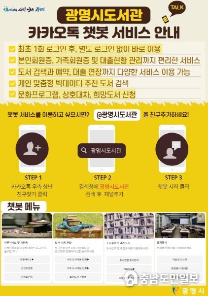광명시 도서관 챗봇 서비스는 시민들이 친숙하게 이용하는 카카오톡 앱을 통해 도서 검색, 대출 예약, 개인 맞춤형 빅데이터 추천 도서 등 다양한 정보를 편리하게 제공한다.