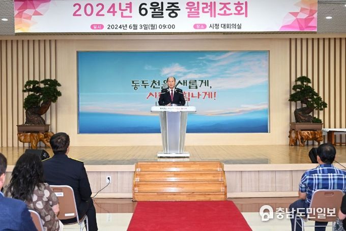 (충남도민일보 / TV / 안희진기자) 동두천시는 3일, 시청 대회의실에서 최재국(동두천시 보훈단체협의회 및 광복회 회장) 명예시장과 함께 6월 중 직원 월례조회를 개최했다.