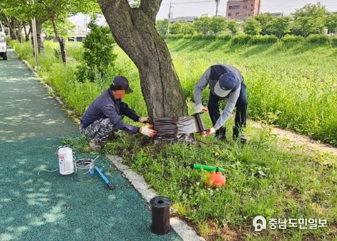 이에 전문 방제업체의 수목방제와 더불어 숲생태관리원 자체 인력이 계양천 산책로 사우동 일대 벚나무에 약제 도포 후 롤트랩을 설치하여 다방면으로 병해충 방제에 노력하고 있다.