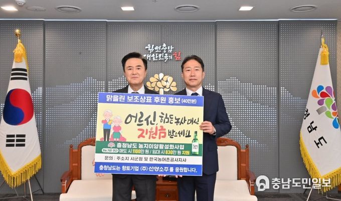 (충남도민일보(도민방송) 정연호기자) 충남도는 13일 도청 외부접견실에서 충청권 향토기업인 선양소주와 ‘소주병 보조라벨 전달식’을 갖고, 고령 은퇴 농업인 농지 이양 활성화 사업 홍보를 강화하기로 했다.
