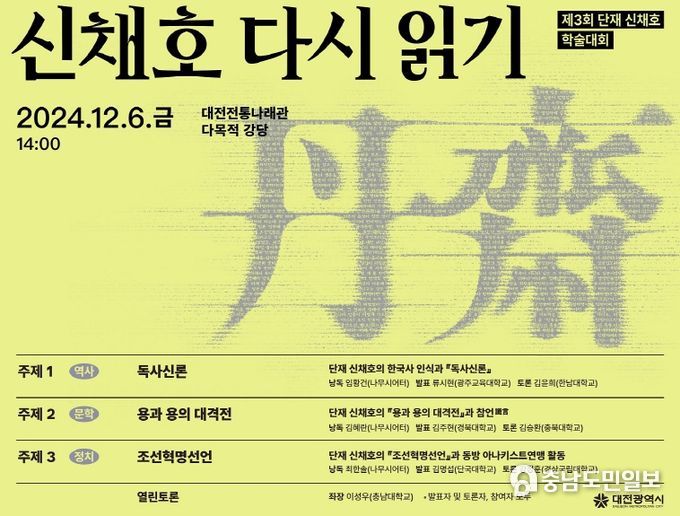 (충남도민일보(도민방송) 정연호기자) 대전시는 단재 신채호 선생 탄신 제144주년을 맞아 6일 대전전통나래관에서 ‘제3회 단재 신채호 학술대회’를 개최한다.