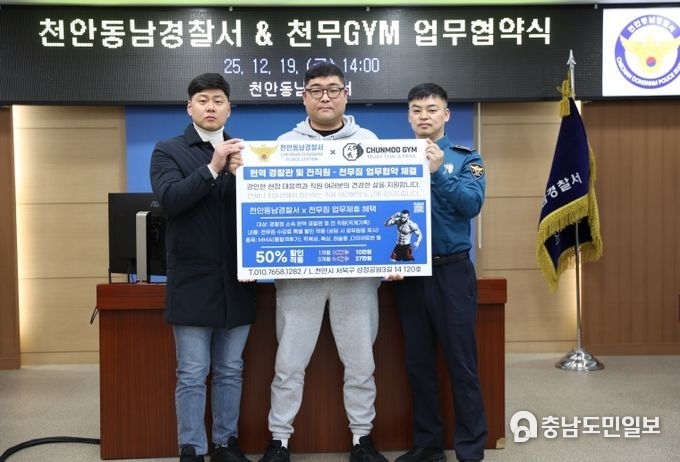 (충남도민일보=천안)죄정환기자/ 천안 동남경찰서(서장 송해영)는 2025년 12월 19일(금) 오후 2시, 천안동남경찰서 중회의실에서 무에타이·MMA 전문 체육관인 ‘천무짐’(관장 문보람)과 ‘경찰관 체력 증진 및 복지 향상’을 위한 업무협약(MOU)을 체결했다고 밝혔다.