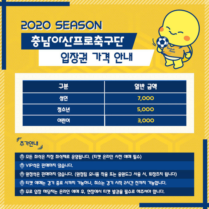 충남아산과 대전의 홈경기 티켓 예매는 온라인(티켓링크)에서만 가능하며 지침에 따라 경기장 전체 수용 인원의 10%, 약 1,600명의 관중 입장을 허용할 예정이다. 현장 판매는 진행하지 않는다. 단, 65세 이상, 장애인 및 미취학 아동 등 무료 입장자는 온라인 예매 후, 현장에서 티켓 발권이 가능하다.