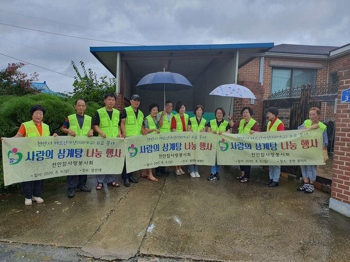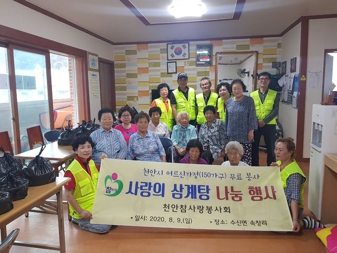 [천안=충남도민일보]정연호기자/ 천안참사랑봉사회(회장 최명규)는 지난 9일 천안인근 독거노인 및 어르신에게 삼계탕 봉사 활동을 실시했다.