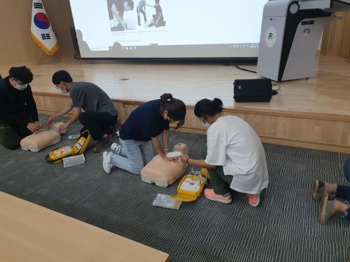주요 훈련 내용은 ▲마네킨 활용 심폐소생술 실습체험 ▲자동심장충격기 활용법▲분말소화기 사용법 ▲옥내소화전 방수 실습등 체험 중심의 교육으로 진행했다.