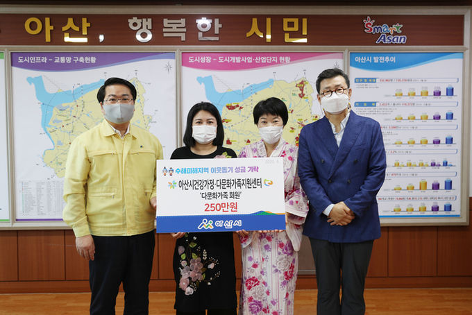 [아산=충남도민일보]정연호기자/ 아산시건강가정·다문화가족지원센터(센터장 조삼혁) 다문화가족 회원일동이 이번 폭우 피해로 어려움을 겪는 이웃들을 위해 지난 21일 아산시(시장 오세현)에 후원금 250만원을 전달했다.