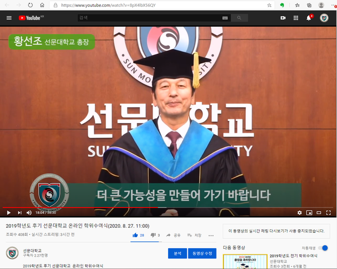 [아산=충남도민일보]정연호기자/ 최근 코로나19가 세계적으로 재확산 중인 가운데 많은 대학이 후기 학위수여식(졸업식)을 취소하고 있다. 이런 가운데 선문대학교(총장 황선조)가 ‘온라인 졸업식’을 진행해 눈길을 끈다.