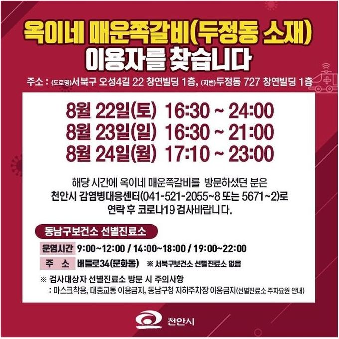 [천안=충남도민일보]정연호기자/ 천안시가 최근 코로나19 확진 판정을 받은 두정동 옥이네 매운쪽갈비(도로명 오성4길 22, 지번 두정동 727 창연빌딩 1층) 식당 이용자를 찾는다는 공지를 올렸다.