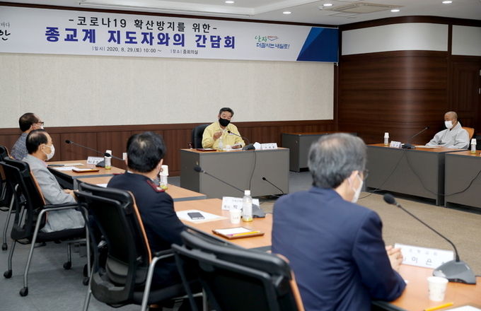 [태안=충남도민일보]문성호기자/전국적으로 코로나19가 재확산하고 있는 가운데, 가세로 태안군수가 코로나19의 지역 확산 방지를 위해 관내 종교계 지도자들과 긴급 간담회를 가졌다.