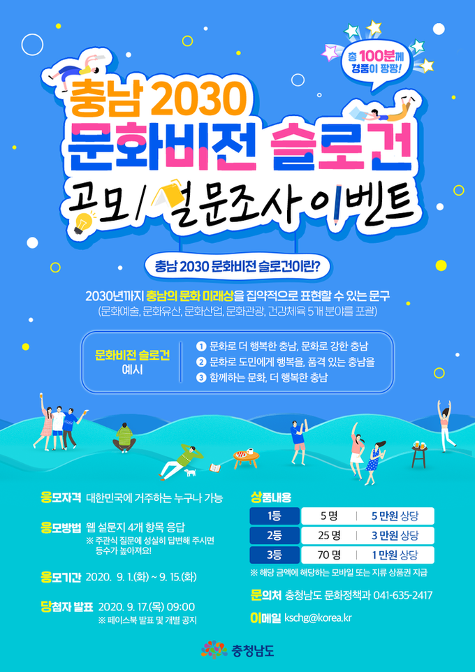 [충남=충남도민일보]정연호기자/ 충남도는 1일부터 오는 15일까지 충남 2030 문화비전 슬로건 공모 및 의견 수렴을 진행한다고 밝혔다.