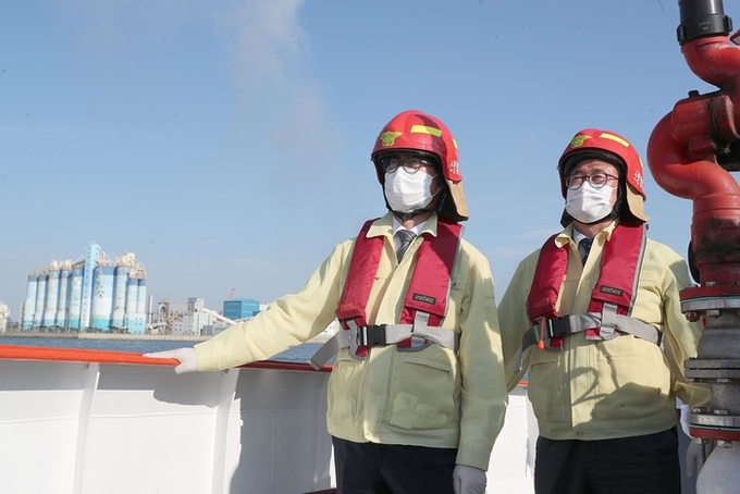 김 의장은 이날 양승조 충남도지사, 김홍장 당진시장, 관계 공무원 등과 함께 당진소방서 주관으로 진행된 ‘서부두 해상 및 육상 화재진압 합동훈련’을 참관했다.