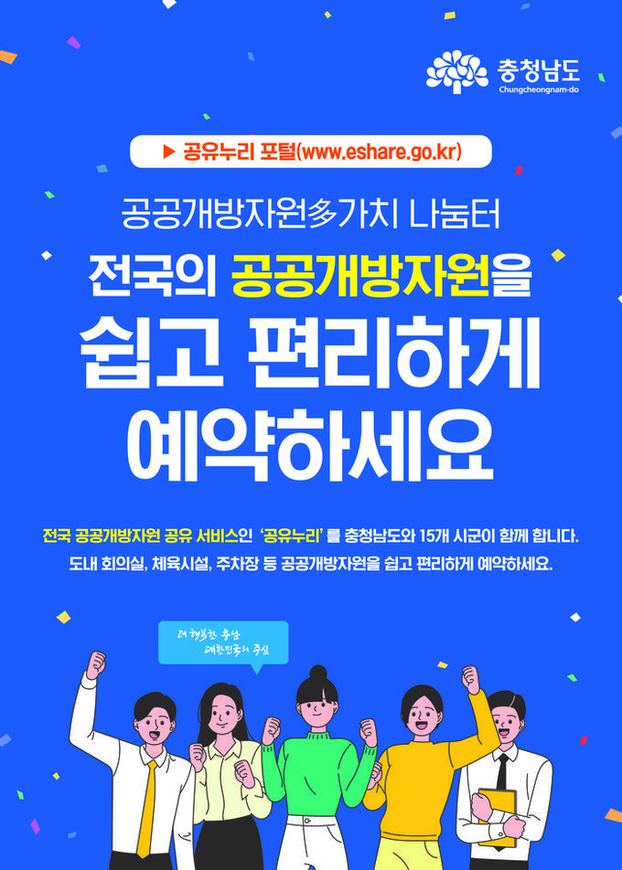 [충남=충남도민일보]정연호기자/ 충남도는 도민 누구나 편리하고 저렴하게 도내 공공개방자원을 사용할 수 있도록 실시간 조회·예약이 가능한 통합 공유 포털 ‘공유누리(www.eshare.go.kr)’를 운영 중이라고 15일 밝혔다.