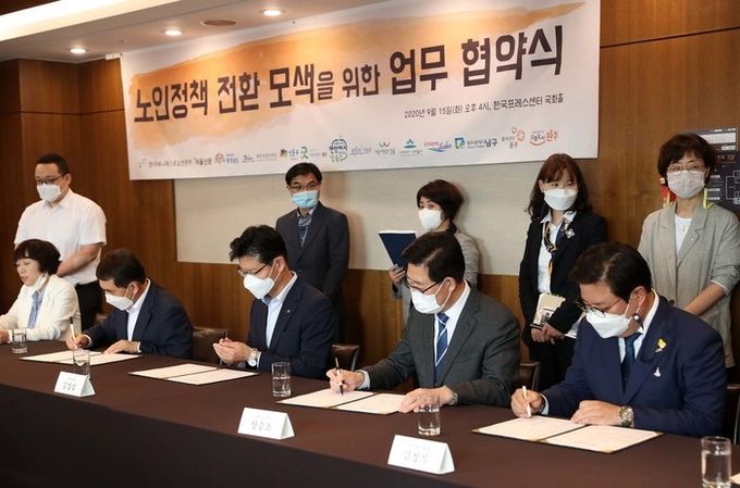 [충남=충남도민일보]정연호기자/ 충남도는 15일 한국프레스센터 국화홀에서 제주특별자치도, 10개 시·군·구 등과 함께 ‘노인정책 전환 모색을 위한 업무협약’을 체결했다.