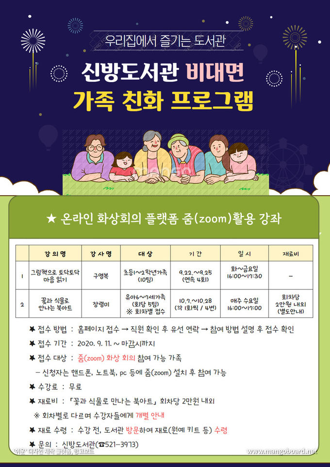 [천안=충남도민일보]인숙진기자/ 천안시 신방도서관(관장 박상임)이 코로나19의 장기화로 지친 시민들을 위해 가족과 함께 집에서 참여할 수 있는 비대면 가족친화프로그램을 운영한다.