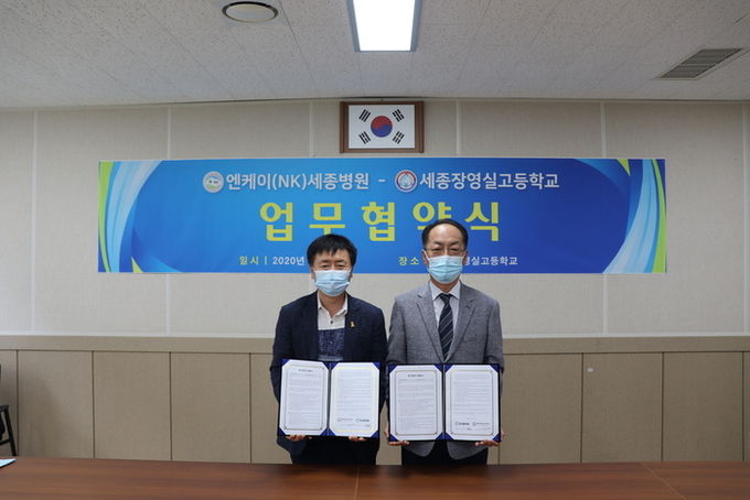 [세종=충남도민일보]정연호기자/ 세종장영실고등학교(교장 최재화, 이하 세종장영실고)는 17일 세종장영실고에서 엔케이(NK) 세종병원과 함께 세종시 보건간호 전문인력 양성을 위한 업무협약식을 가졌다.