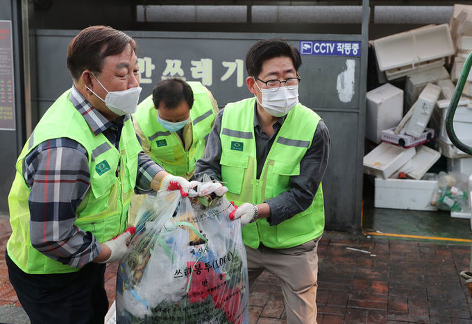 양 지사는 예산군 예산읍 역전시장 인근에서 환경미화원들을 격려하고, 쓰레기 수거 등 거리 청소를 함께했다.