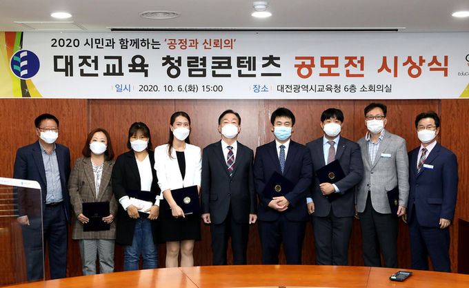 [대전=충남도민일보]정연호기자/ 대전광역시교육청(교육감 설동호)은 6일 오후 3시 소회의실에서 시민 및 교직원 대상인 일반부 5개 분야별 최우수상 수상자를 대상으로 2020 시민과 함께하는 ‘공정과 신뢰의’ 대전교육 청렴콘텐츠 공모전 시상식을 개최했다.