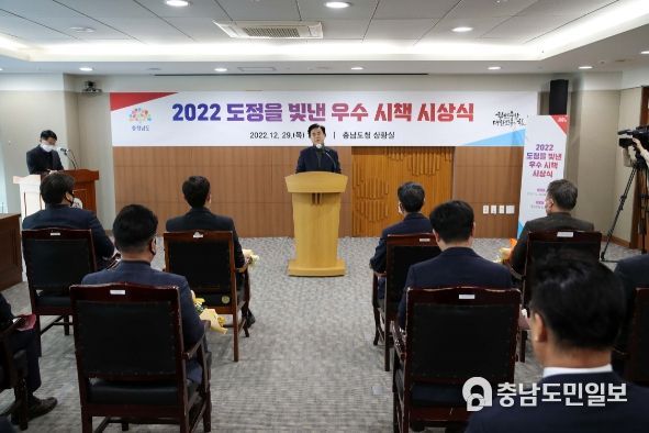 이날 도청 상황실에서 열린 ‘2022 충남 도정을 빛낸 우수시책 시상식’에서는 김태흠 지사가 직접 우수시책 소관 부서장 등에게 표창패를 전달하며 수상을 축하했다.