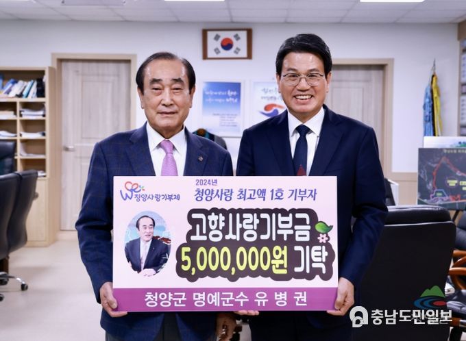(충남도민일보 / 정호영기자) 유병권 충남 청양군 명예군수가 지난해에 이어 올해도 청양사랑기부제 연간 한도액 500만 원을 쾌척하면서 첫 신호탄을 쏘아 올렸다.