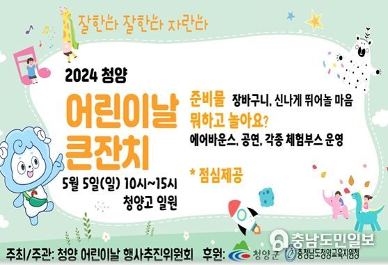 (충남도민일보 / TV / 문성호기자) 청양군은 오는 5일 어린이날을 맞아 오전 10시부터 청양중, 고등학교에서 “청양어린이날 큰잔치(잘한다 잘한다 자란다)” 행사를 개최한다고 밝혔다.