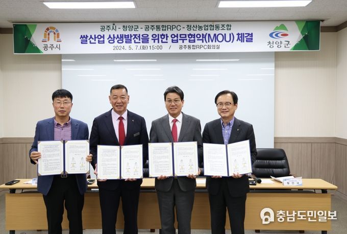 (충남도민일보 / TV / 문성호기자) 청양군과 공주시, 정산농협, 공주통합미곡처리장(RPC) 등 4개 기관은 7일 공주시 의당면 공주통합미곡처리장(RPC)에서 청양에서 재배한 향진주 벼를 공주통합미곡처리장(RPC)에서 위탁가공하여 쌀을 생산하는 것을 골자로 하는 ‘청양군-공주시 쌀 산업 상생 발전을 위한 업무협약(MOU)’을 체결했다.