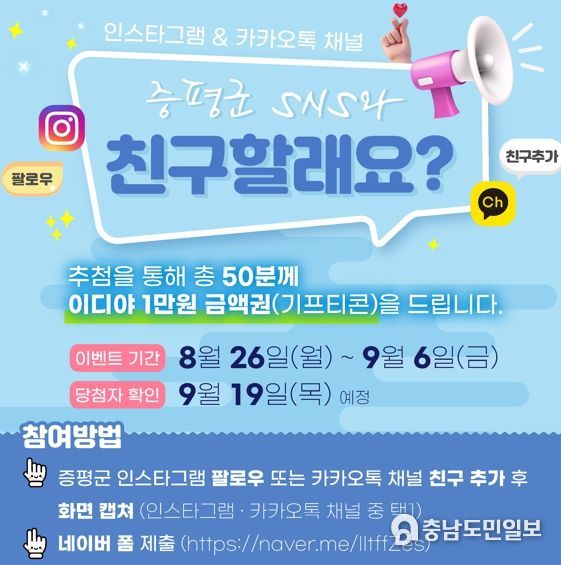 (충남도민일보 / TV / 정호영기자) 충북 증평군이 다음 달 6일까지 증평군 공식 SNS 구독 이벤트를 진행한다고 26일 밝혔다.