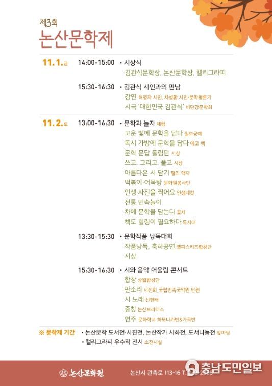 오는 11월 1일부터 2일까지 논산문화원 향기마루 및 야외마당에서는 ‘제3회 논산문학제’가 개최될 예정이다.