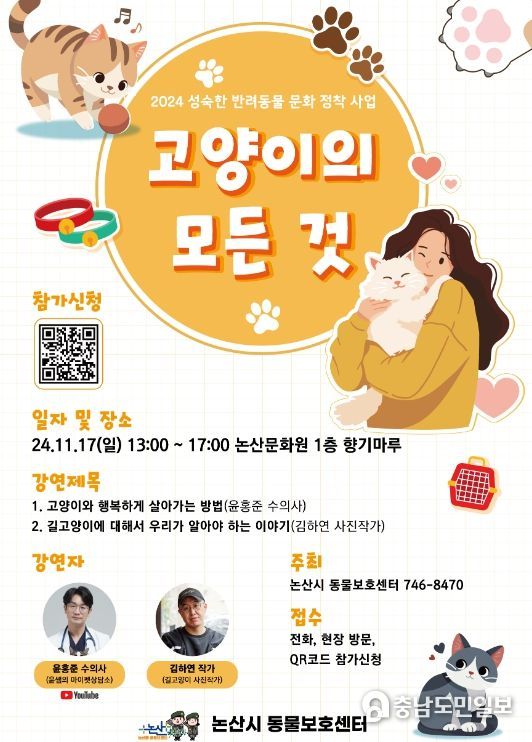 이번 강연은 논산시 동물보호센터에서 주관하며, 윤홍준 수의사와 김하연 사진작가를 강사로 초청하여‘고양이와 행복하게 살아가는 방법’‘길고양이에 대해서 우리가 알아야 하는 이야기’를 주제로 진행될 예정이다.