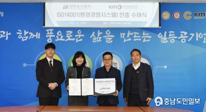 (충남도민일보(도민방송) 정연호기자) 천안도시공사는 11일 한국경영인증원(KMR)으로부터 국제환경 관리 시스템 표준인 환경경영시스템(ISO14001) 인증을 취득했다고 밝혔다.